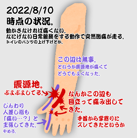 体感7割くらい回復した感触なんですが、指先細かい作業はまだ一切出来ない感じです。「摘まむ」動作がすごい痛い。あと、タオル類をふんわり摑んで顔や体を拭くのが無理。大きくパーに指を開くのも痛い。…あれ、まだ言う程回復していないのでは…?
