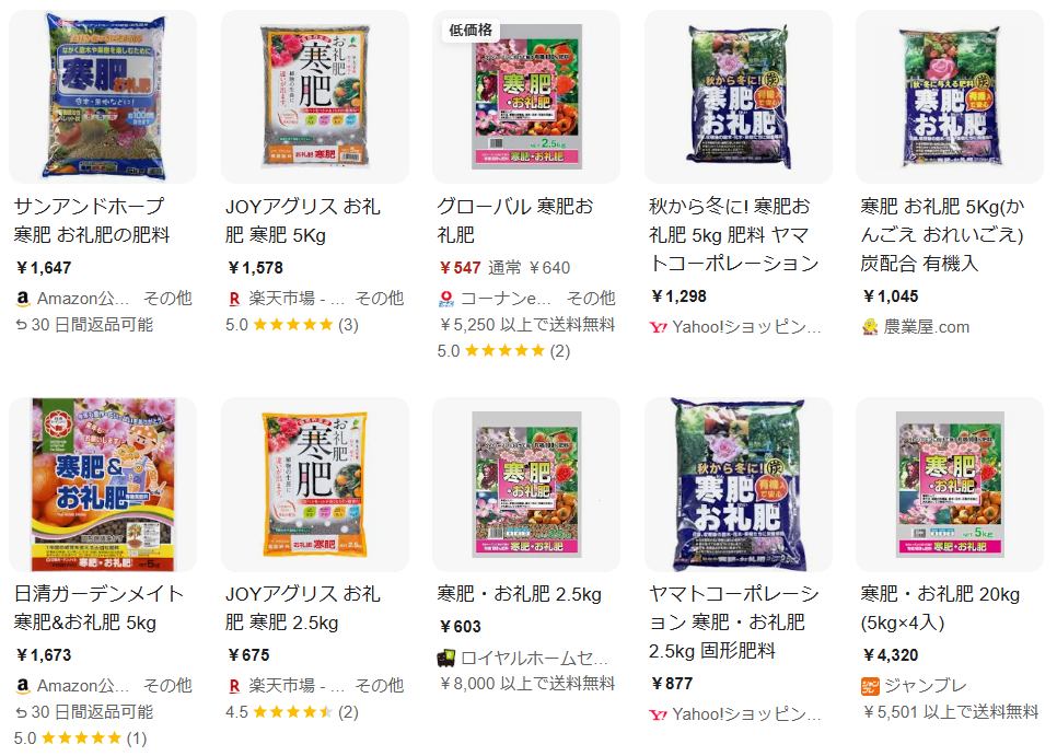 先に枯れ枯れのタマイブキに発酵油粕を撒いていましたが、「冬には冬越用に肥料をあげると良い」とネットで見かけたので、お勧めされていた商品名そのものズバリ『寒肥・お礼肥』というやつを一袋購入してあったのが幸いしました。