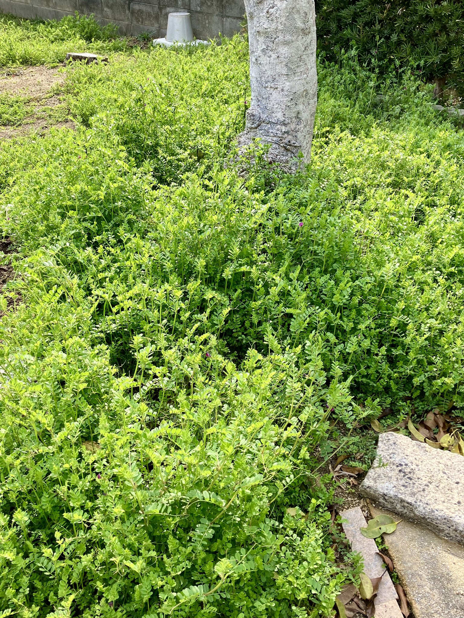 多分、カラスノエンドウです。割と雑草ではお馴染みだけど、昨年はうちの庭でこんなに見かけなかったので、ススキ&チガヤが消えただけで「今ならワイが占拠出来るわー」とばかりにこんなモッサモサに伸びてくるの、雑草界のシマ争い不思議というか凄いねぇ。