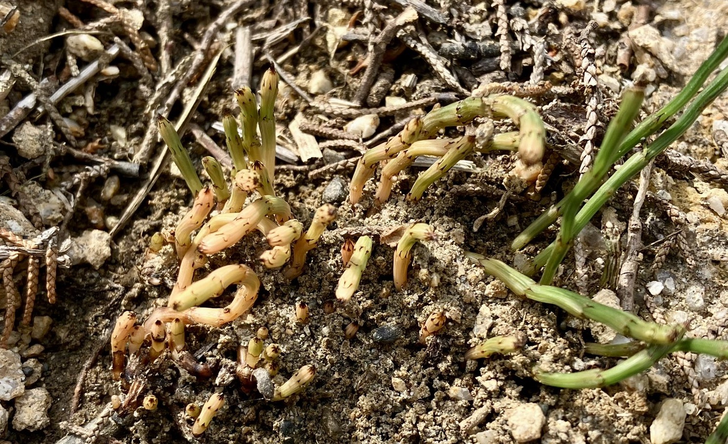 土を良い状態に保つために雑草を適度に残して庭を維持する、というテクは昨年に専門誌読んで知りましたが、カラエンさんここまで背が高くなければ刈らずに残してもいいのになあ…と思いました。イヌドクサはカラッカラで固い、他の雑草には厳しい土で生き生きとするからな…そういう意味でも、土の状態をよくするのもイヌドクサ撲滅にプラスに働くかもしれない。でも刈らずに残して許せる雑草の高さ、シロツメクサくらいまでだよな…