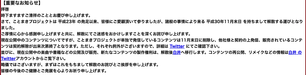 さて、ことまきプロジェクトは 平成23年 の発足以来、皆様にご愛顧頂いて参りましたが、諸般の事情により来る 平成30年11月末日 を持ちまして解散する運びとなりました。