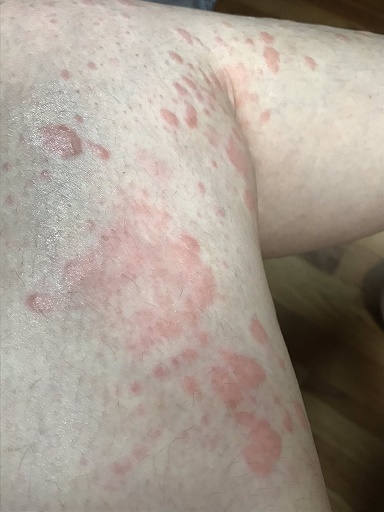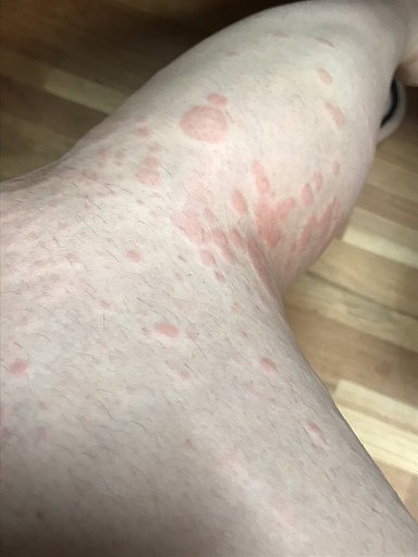 発疹の丸いのがすごい色が赤くて、実際の皮膚の色との落差が激しいのもあってすごい気持ち悪い足……いやホントにほぼ99%発疹出てるのが腿~膝裏なんですけど、なぜだろう。謎。
