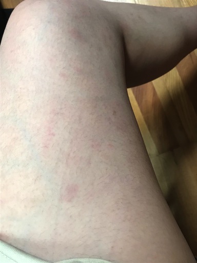 左右の外腿に各3〜5個程、濃い赤い発疹が出てるのと、下着の締め付け跡が薄いミミズ腫れになってるくらいで、よくなってる…よくなってきてるよ……よし……