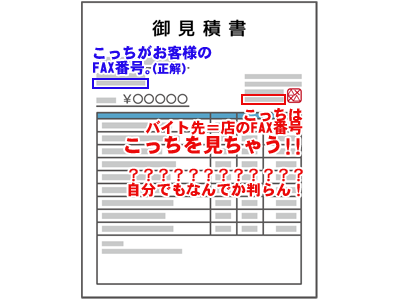 本当にビックリして、何故そっちに目が吸い寄せられるのか謎なんですけど判子押してあるからかな?っていうか見積書に客のFAX番号とウチの店のFAX番号両方入ってるの紛らわしくない??判らん……判らん……いや、そっちに視線が吸い寄せられてそっちに書いてある番号を押してしまう理由……