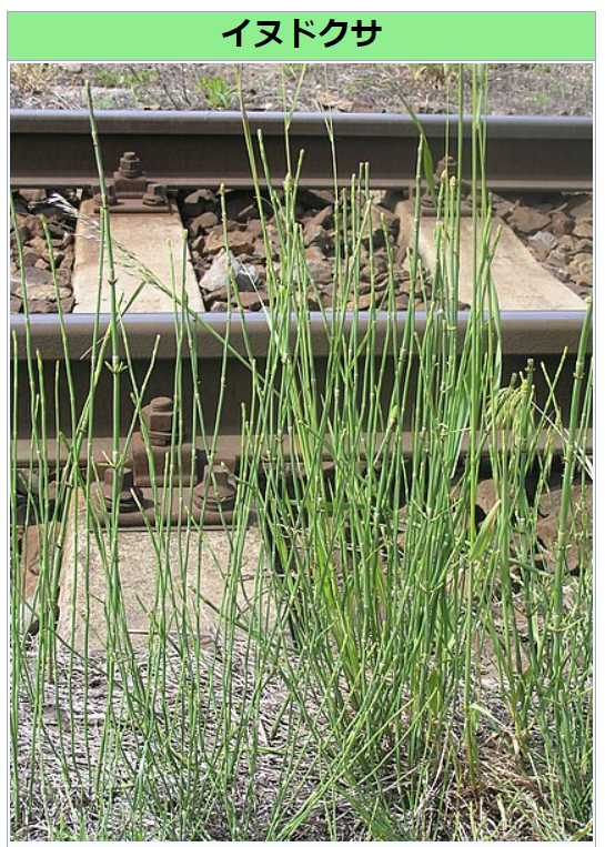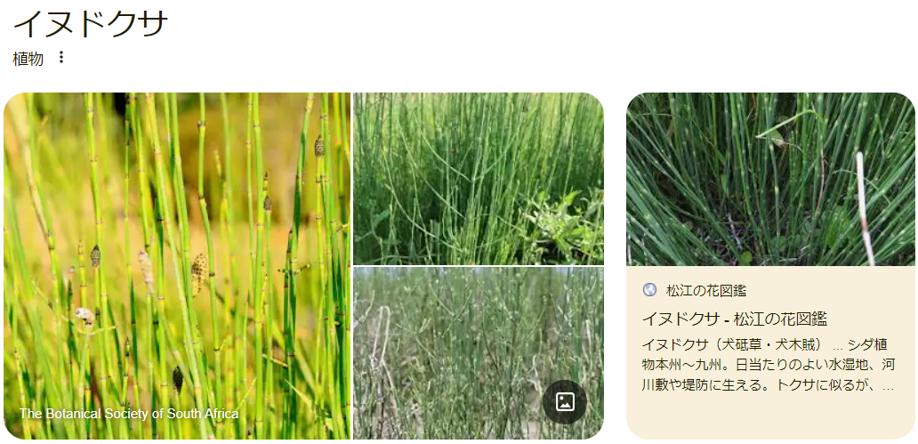 イヌドクサはトクサ科のシダ植物の1つ。トクサによく似ているが、普通は一回り細く、また直立する茎に少数の側枝を生じる点で区別される。ハイハイハイ、これだわ~~!!!